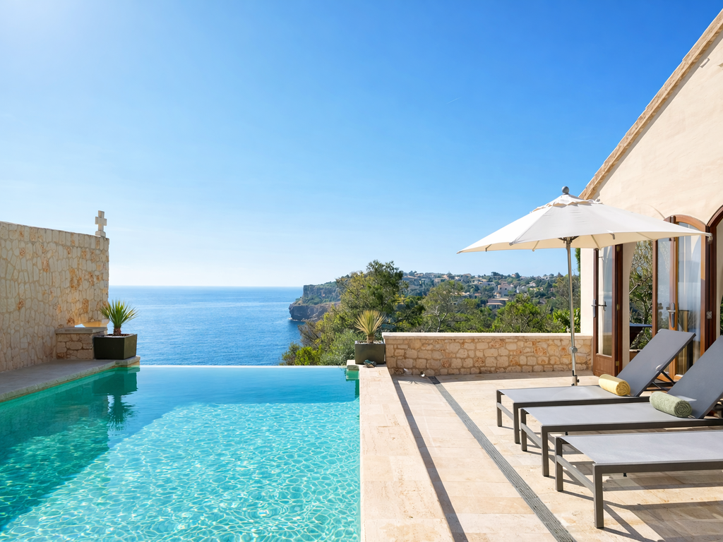 Face à Cala Santanyí et entourée de pins protégés, cette villa séduit par sa piscine à débordement et ses terrasses orientées vers la mer. Son agencement allie espace, intimité et connexion privilégiée avec la nature majorquine.