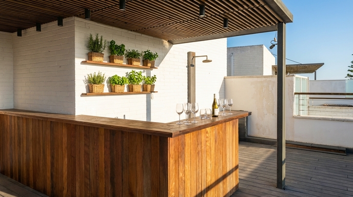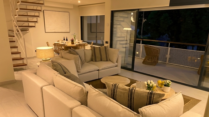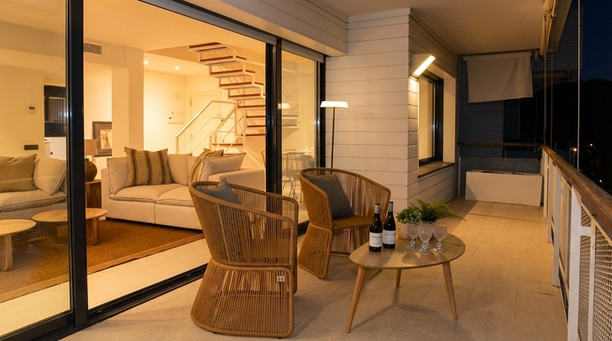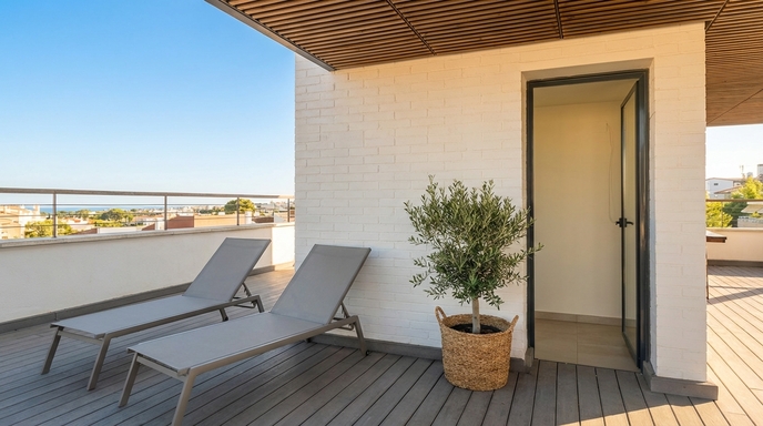 Avec une disposition pratique et des espaces généreux, l’appartement allie simplicité et fonctionnalité dans une atmosphère paisible. La lumière naturelle traverse chaque pièce, mettant en valeur la chaleur du salon, l’amplitude de la chambre et la sérénité des lieux. Un escalier moderne mène à la terrasse du solarium, un espace idéal pour profiter du climat, lire, partager un moment ou simplement contempler le ciel de Sitges. Chaque détail est pensé pour un séjour agréable et sans contraintes.