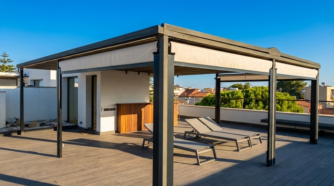 Terrasse sur le toit (privée ou commune?) : Grand solarium avec vue dégagée et pergola ombragée, idéal pour se détendre, bronzer ou dîner en plein air.