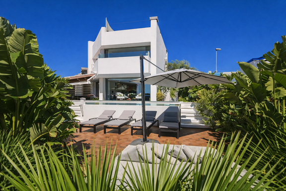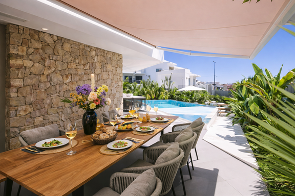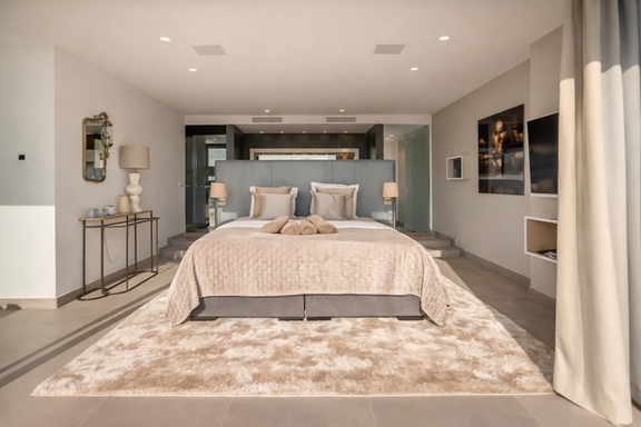 À l’extérieur, la villa offre un cadre privilégié avec une piscine privée, un jacuzzi et plusieurs terrasses qui créent différents espaces pour se détendre à tout moment de la journée. Des zones chill-out aux espaces de repas en plein air, tout est conçu pour profiter du style de vie méditerranéen.