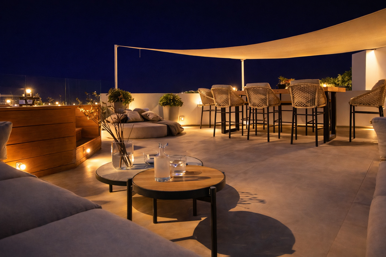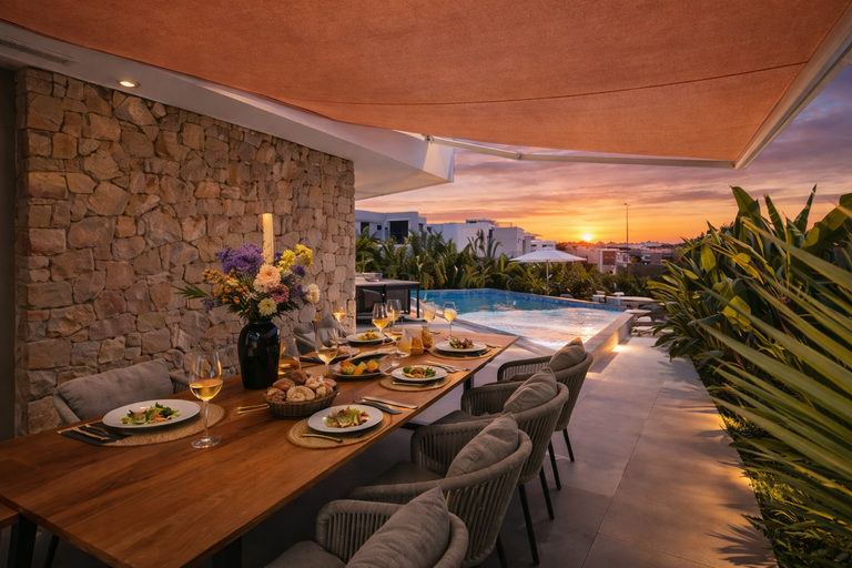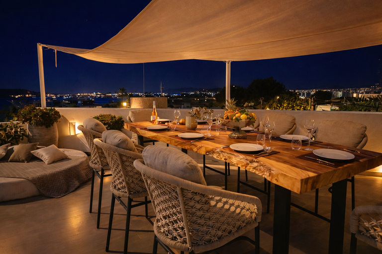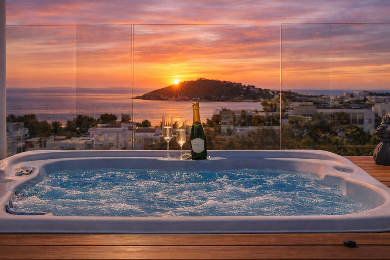 Au coucher du soleil, le jacuzzi devient un espace de détente idéal, tandis que le ciel se teinte de couleurs dorées. Le soir, les dîners en terrasse offrent un cadre intime et élégant sous les étoiles.