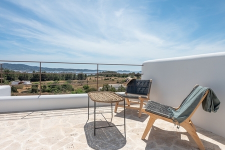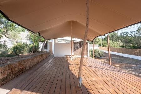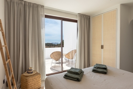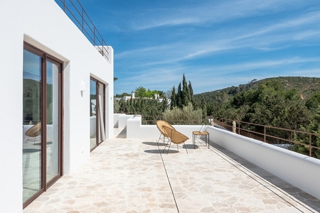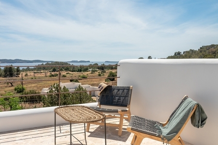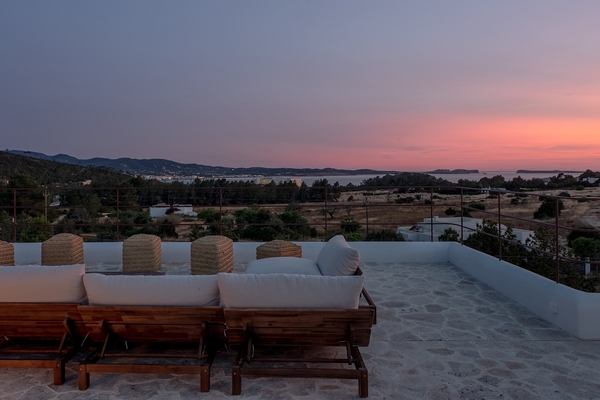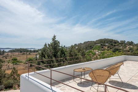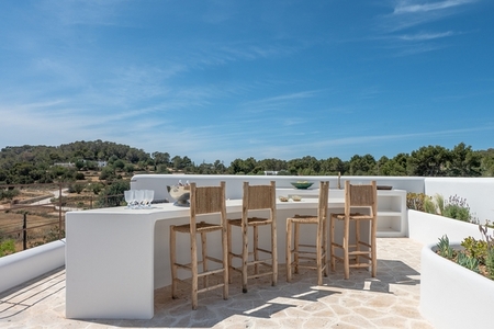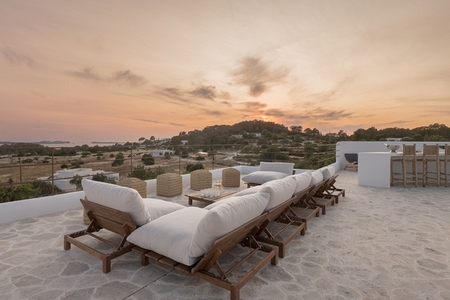 À l’extérieur, la piscine privée occupe une place centrale, parfaitement intégrée à l’environnement naturel et entourée de végétation locale. Les terrasses, couvertes et en plein air, offrent différents espaces à apprécier tout au long de la journée, des petits-déjeuners paisibles aux dîners sous les étoiles. Le rooftop, avec ses vues ouvertes sur la Méditerranée et la côte ouest, apporte un espace exclusif pour admirer les couchers de soleil, tandis que les zones lounge et de repos complètent un ensemble pensé pour vivre l’art de vivre ibicenco avec calme, intimité et raffinement.