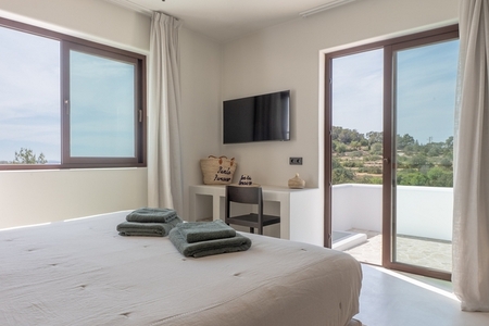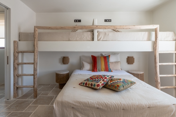Les intérieurs offrent un niveau de confort et d’exclusivité exceptionnel. Six chambres doubles avec salle de bain en suite garantissent intimité et tranquillité, avec une literie haut de gamme, la climatisation et des détails artisanaux soigneusement sélectionnés. Les salles de bain, élégantes et fonctionnelles, associent pierre locale, douches spacieuses et baignoires îlot avec vues. Le salon, vaste et lumineux, s’ouvre directement sur les espaces extérieurs et la piscine, tandis que la cuisine ouverte de design, entièrement équipée, se prête aussi bien aux moments en famille qu’aux expériences gastronomiques les plus raffinées.