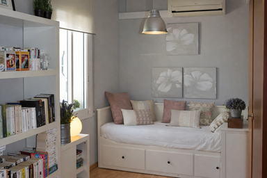 Climatisation uniquement dans les chambres et ventilateurs dans le reste de la villa