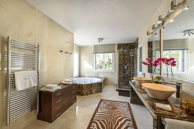 Salle de bain avec double vasque, baignoire jacuzzi, douche à l’italienne, WC et bidet.