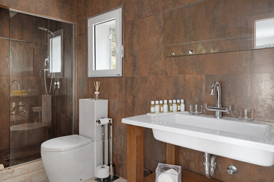 L’intérieur de Villa Koral a été conçu pour offrir une expérience de confort exceptionnel. La villa dispose de six chambres, toutes avec salle de bain en suite, pensées comme de véritables espaces dédiés au repos et à la détente. Chaque chambre se distingue par des literies haut de gamme, de grandes baies vitrées et des vues ouvertes sur la mer et les collines environnantes, créant une agréable sensation d’espace et de tranquillité.