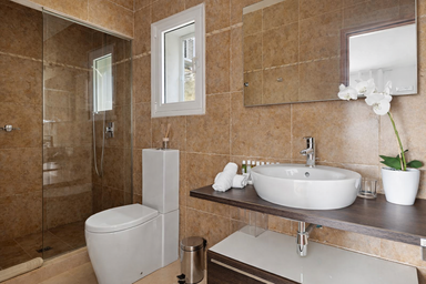 Salle de bain avec vasque simple, douche à l’italienne et WC.