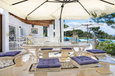 À l’extérieur, la piscine privée occupe une place centrale, parfaitement intégrée à l’environnement et orientée vers la Méditerranée. Les terrasses, couvertes et à ciel ouvert, offrent différentes ambiances tout au long de la journée. Espaces lounge, transats, salle à manger extérieure et barbecue composent un cadre idéal pour profiter pleinement de l’art de vivre ibicenco, en toute discrétion.