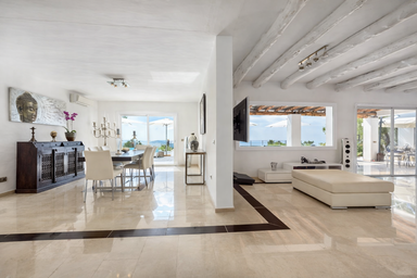 Les espaces extérieurs comptent parmi les véritables atouts de Villa Koral. Plusieurs terrasses, couvertes et à ciel ouvert, s’ouvrent sur l’horizon et offrent des cadres idéaux pour la détente et la contemplation. La piscine privée, entourée de transats et de parasols, invite à profiter du soleil ibicenco avec la mer en toile de fond. Des espaces lounge soigneusement aménagés permettent de se relaxer à tout moment de la journée, tandis que la salle à manger extérieure et le barbecue sont parfaits pour de longs déjeuners et des dîners sous les étoiles méditerranéennes.