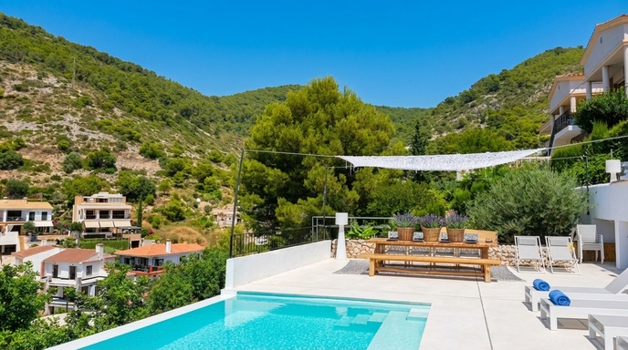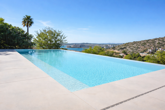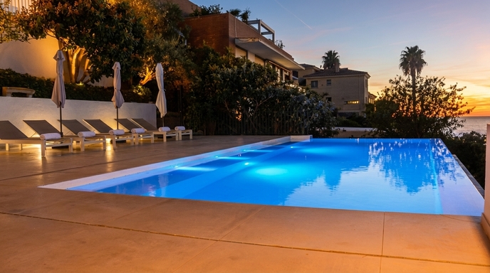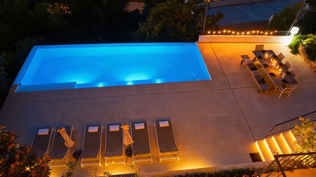 Enfin, des escaliers supplémentaires descendent vers la piscine infinie à double face, entourée de chaises longues et de parasols, où vous pourrez vous détendre et profiter du climat méditerranéen. Près de la piscine, il y a une table à manger supplémentaire, parfaite pour profiter d’un repas en plein air.