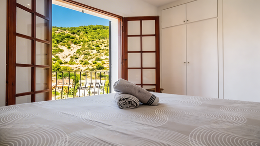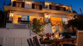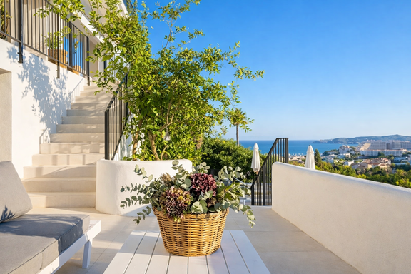 L’entrée principale se trouve au dernier étage, où la première suite, équipée d’un grand lit double et d’une salle de bain complète, est située face à l’entrée. Un balcon longe tout l’étage, reliant les chambres et offrant plusieurs espaces de détente avec des tables et des sièges, idéaux pour profiter des vues sur la mer et la piscine située aux niveaux inférieurs.
