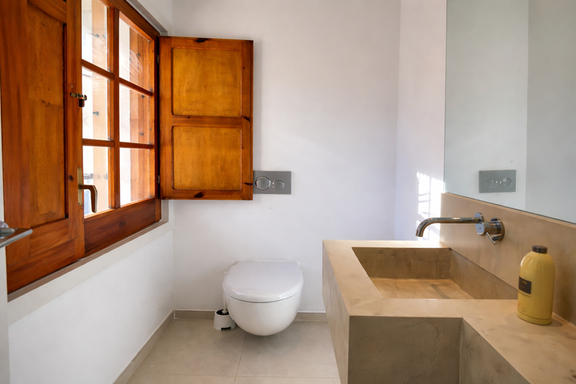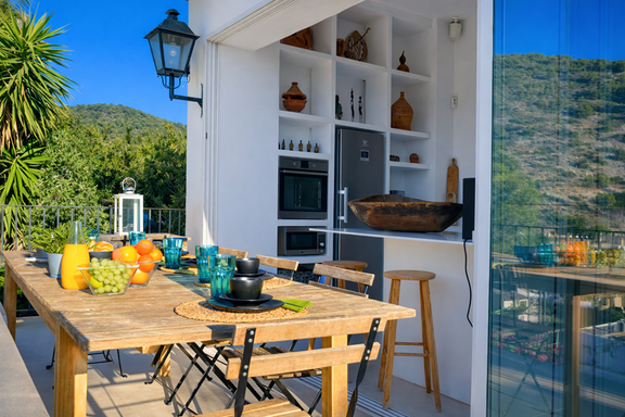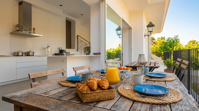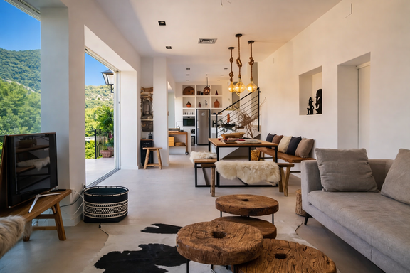 Au niveau suivant se trouvent le salon et la salle à manger, un espace lumineux et accueillant grâce à ses grandes fenêtres en verre qui laissent entrer une abondante lumière naturelle tout au long de la journée. Le salon dispose d’un canapé confortable face à la télévision, tandis que la grande salle à manger est accompagnée d’une cuisine ouverte entièrement équipée. Depuis les fenêtres de la salle à manger, vous accédez à un balcon avec un second espace de salle à manger extérieur, offrant une vue directe sur la piscine.