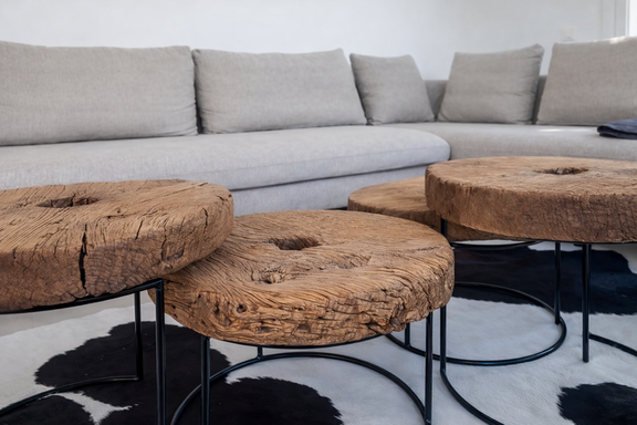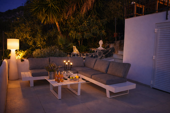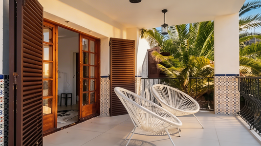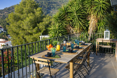 Un escalier extérieur depuis ce balcon mène au dernier étage, où se trouve un espace extérieur avec un canapé et une table basse, un endroit idéal pour se détendre.