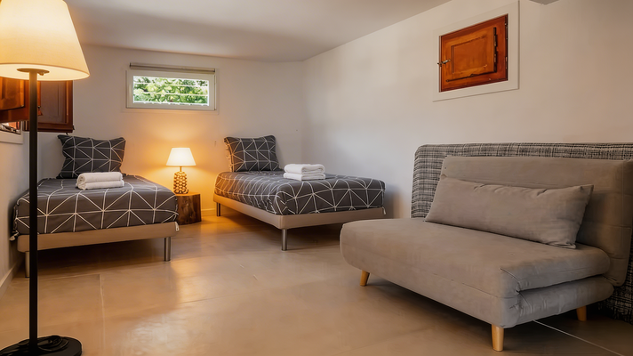 Au même étage, se trouvent deux autres chambres avec des lits doubles, une salle de bain complète et une chambre supplémentaire avec un lit simple. Un escalier mène au niveau inférieur, où se trouve une chambre avec deux lits simples et un canapé-lit, ainsi qu’une salle de bain complète.