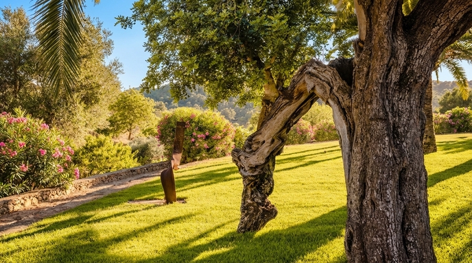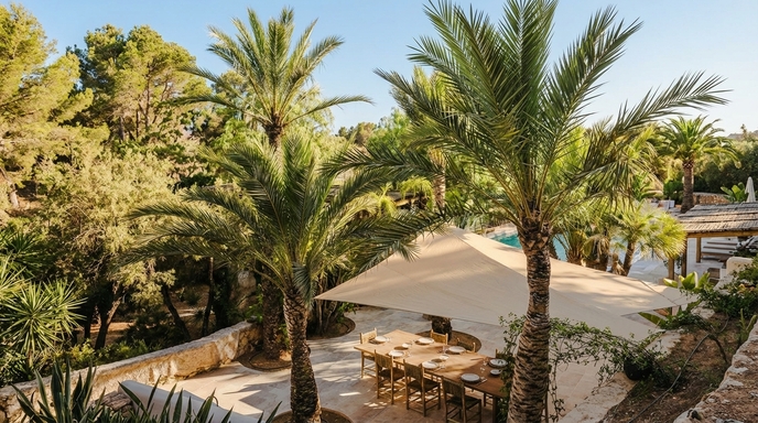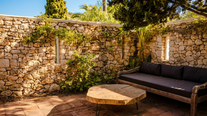 L’un des atouts majeurs de cette Villa de luxe Ibiza près de la plage réside dans son jardin exceptionnel, véritable œuvre vivante empreinte d’histoire et d’énergie. Sentiers de pierre, recoins discrets et terrasses intégrées au paysage s’entrelacent parmi palmiers, oliviers et arbres fruitiers. Cet écrin végétal ne constitue pas seulement le décor de la villa, mais fait pleinement partie de son identité.