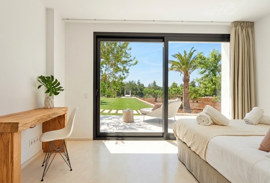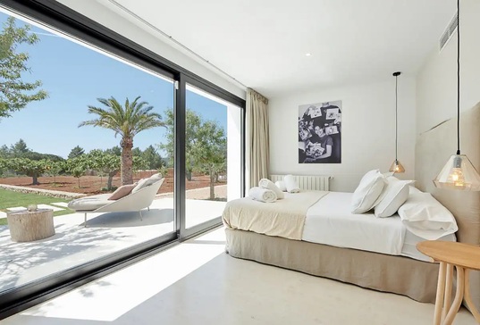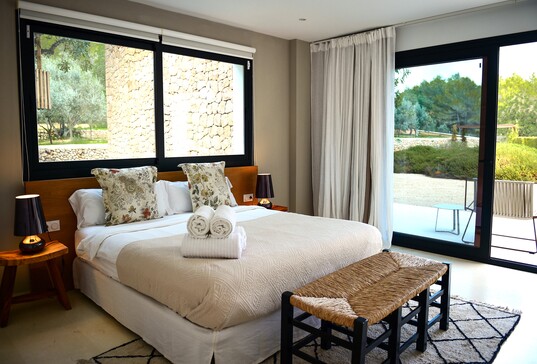 Les intérieurs de la Villa Ibiza Can Pep Sa Guaita se distinguent par leur espace et leur élégance, comprenant un salon de 80 m² avec des baies vitrées panoramiques et un accès direct à la terrasse, une cuisine design entièrement équipée, ainsi qu’une buanderie avec un espace de séchage extérieur. Au rez-de-chaussée, vous trouverez quatre chambres avec terrasses privées et vue sur la campagne, dont une avec patio intérieur et jacuzzi privé. À l’étage supérieur, deux suites de luxe : une suite de 70 m² avec salle de bain attenante, baignoire hydromassante, dressing et terrasse privée avec vue panoramique, ainsi qu’une autre suite de 40 m² avec vue sur les montagnes.