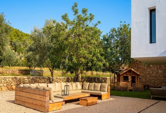 La piscine de 14 x 4 mètres, entourée de chaises longues et d’espaces de détente, est parfaite pour profiter du soleil méditerranéen, tandis que le jacuzzi extérieur offre un cadre idéal pour des nuits magiques sous les étoiles. L’extérieur de la villa est un véritable paradis, avec des jardins méditerranéens remplis d’orangers, de citronniers, de cerisiers et d’oliviers centenaires, une vaste pelouse, ainsi qu’un espace barbecue et salle à manger extérieure, agrémenté d’une noria centenaire et d’un ancien système d’irrigation (safareig).